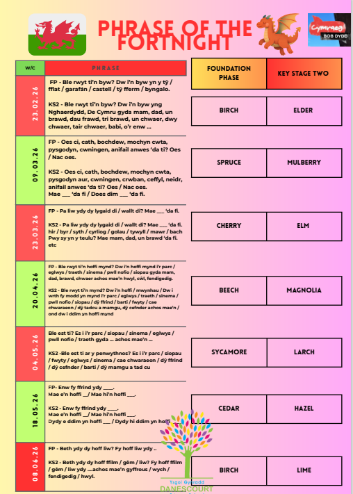 Our Phrase of the Fortnight initiative is designed to celebrate and strengthen the use of the Welsh language across our school community. Every two weeks, a different class takes the lead by creating an engaging launch video to introduce a new Welsh phrase for everyone to learn and use. We share two versions of each phrase – one for our Foundation Phase learners and one for Key Stage 2 – so that all pupils can take part confidently.